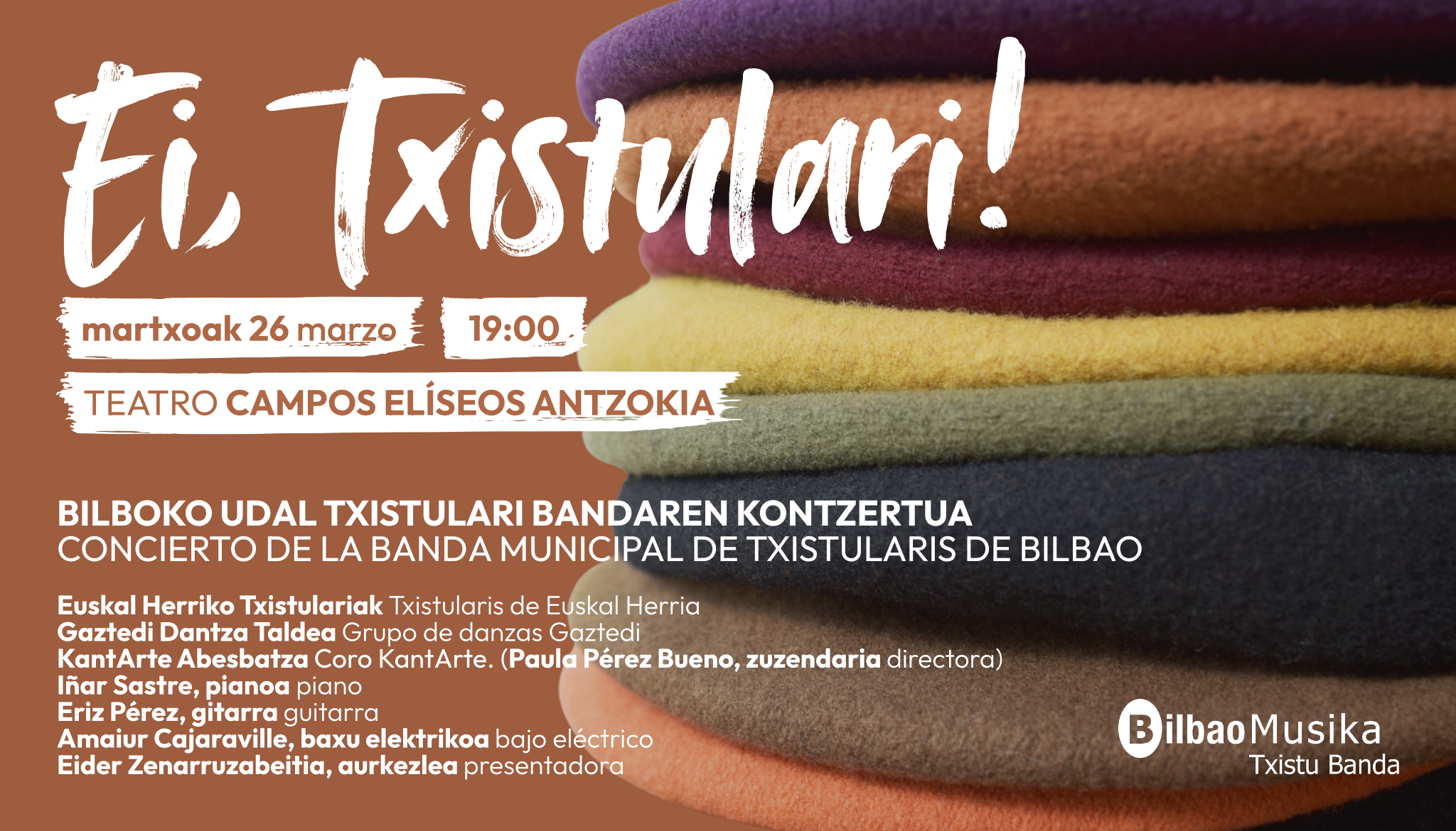Concierto de la Banda Municipal de Txistularis de Bilbao: "EI, TXISTULARI!"Dirección a cargo de Gorka ZabaletaBanda Municipal de Txistularis de BilbaoTxistularis: Gorka Zabaleta e Idoia KareagaSilbotes: Peio Irigoien y Sabin BikandiPercusión: Asier GarciaCon la colaboración de: Txistularis de Euskal HerriaIñar Sastre, pianoEriz Pérez Eguiluz, guitarraAmaiur Cajaraville, bajo eléctricoGrupo de danzas GaztediCoro KantArte - Paula Pérez Bueno, […]